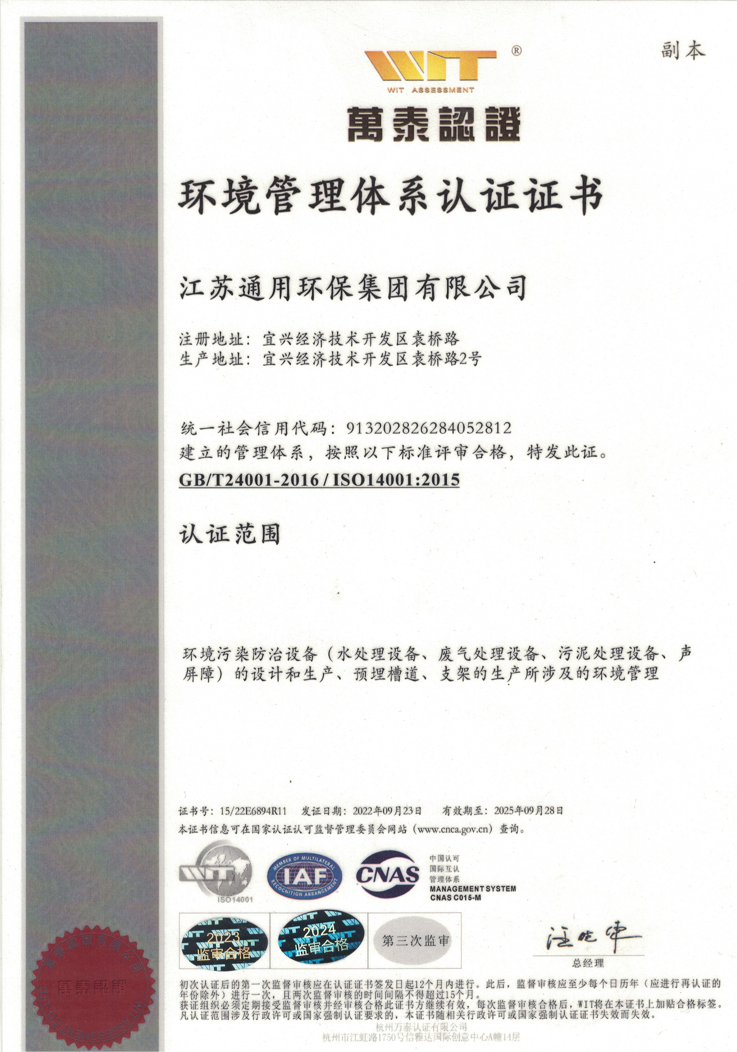 ISO14001认证证书
