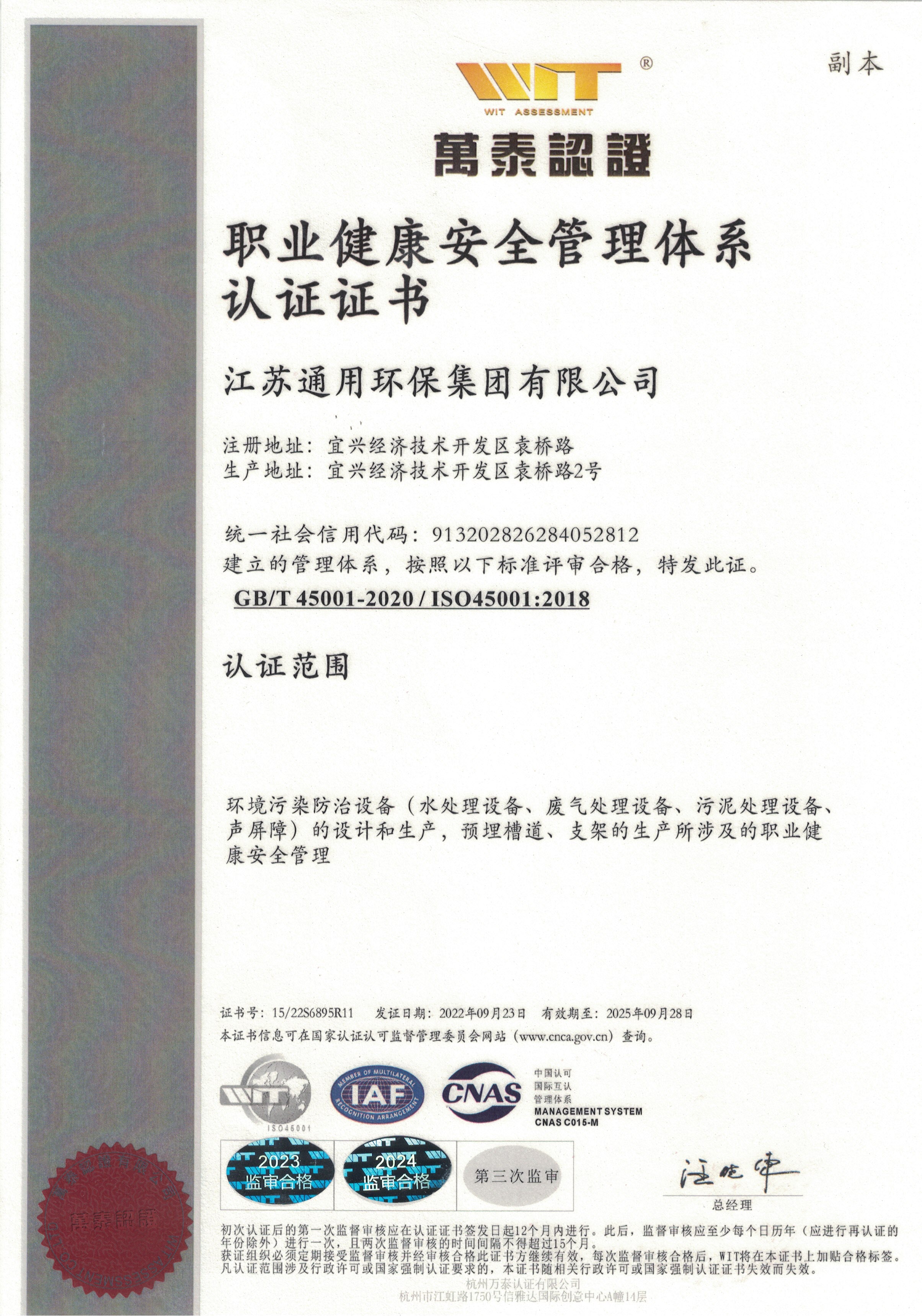 ISO45001职业健康认证证书