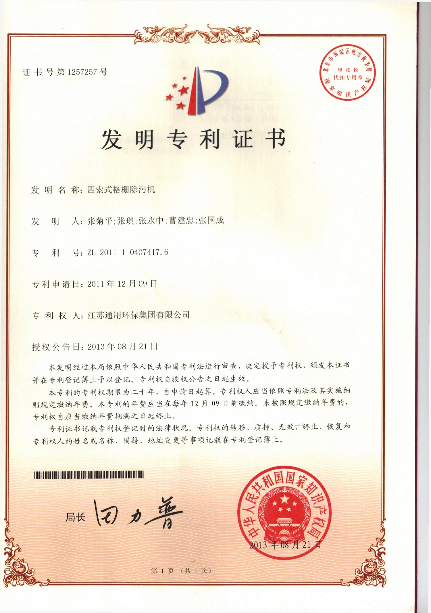 桁车式刮吸泥机的行走纠偏装置发明专利证书2014.9.10